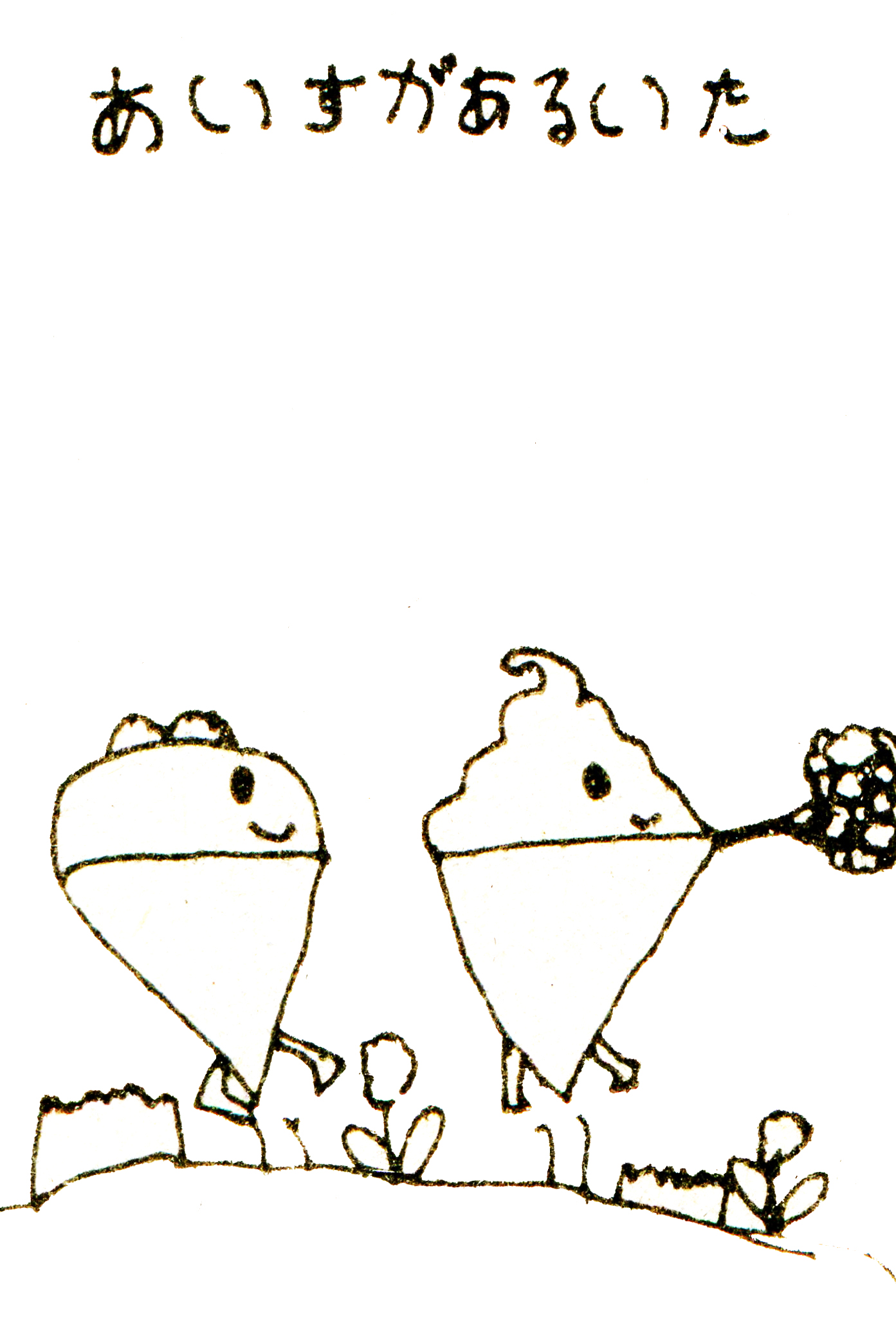 7歳の頃に描いた『あいすがあるいた』という絵が地元の新聞に載りましてね。砂絵を描き始めたときに『そういえばなんか昔描いたよな!』と母にそのコピーを送ってもらい、この絵からたくさんのインスピレーションを受けてアイスの絵を描いてきました。一番思い入れのあるキャラクターです。